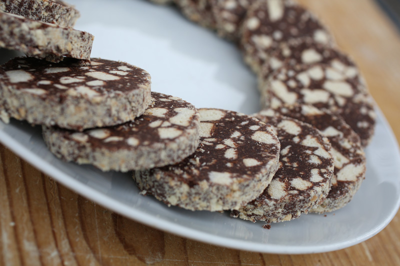 Biscotti sbriciolati…zucchero…burro…uova…cacao: si mette tutto in una grande ciotola e con un mestolo di legno si amalgamano per bene questi ingredienti semplici e genuini, che formano un panetto compatto e profumato. Poi, su un piano da lavoro, con l’aiuto di un mattarello di legno, si realizzano dei salamotti di diverse dimensioni e pesi; si passano negli amaretti sbriciolati e…voilà: ecco un dessert al cacao pronto per essere gustato.