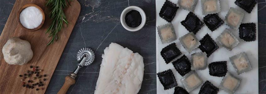 Ravioli al Nasello con sfoglia bicolore - Il nasello è prima cotto con erbe aromatiche e poi unito al resto degli ingredienti per il ripieno finale. Racchiuso in una sfoglia bicolore, fatta con il nero di seppia, per appagare anche il piacere della vista e stimolare tutti i sensi. I palati più esigenti non possono chiedere di meglio.