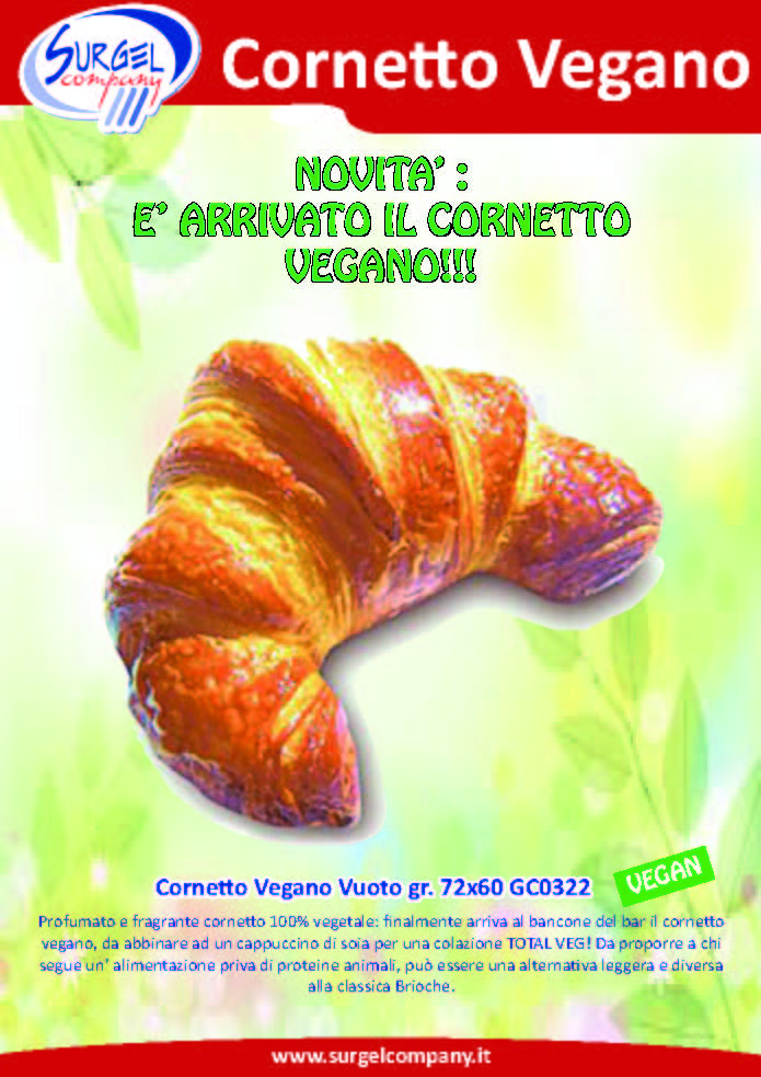Da oggi però, la colazione al bar non sarà più un problema nemmeno per i Vegani. E’ arrivato in Surgel il Cornetto vegano Vuoto! 72 grammi di fragrante pasta brioche, che sfoglia e profuma come un cornetto classico! Proponetela nel vostro locale in un menù dedicato, abbinata magari ad un cappuccio con latte di Soya e ad una spremuta di arancia! Inventate la colazione Vegana 100% vegetale e promuovetela attraverso materiale dedicato per far sapere a chi segue uno stile alimentare privo di proteine animali, che nel vostro Bar è possibile fare LA COLAZIONE VEG!