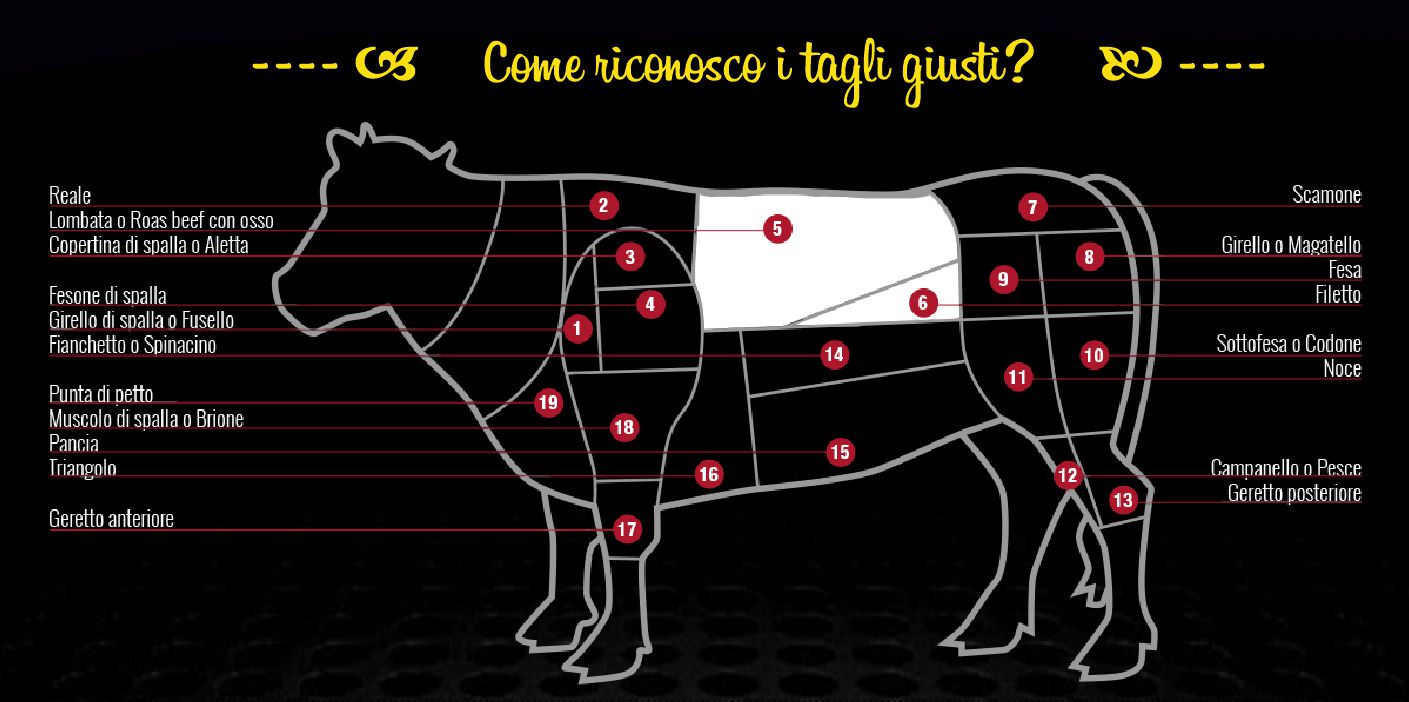 La razza Frisona pezzata rossa garantisce uno standard qualitativo ottimale, ed è sempre reperibile, a differenza di alcune razze italiane. Un'alimentazione alternata anche a cereali, favorisce una leggera marezzatura (grasso intramuscolare) della carne aggiunge sapore alla morbidezza naturale. La frollatura è di circa 20 giorni per garantire la massima tenerezza e favorire quei processi fisico-chimici che rendono la carne più morbida e facilmente digeribile.